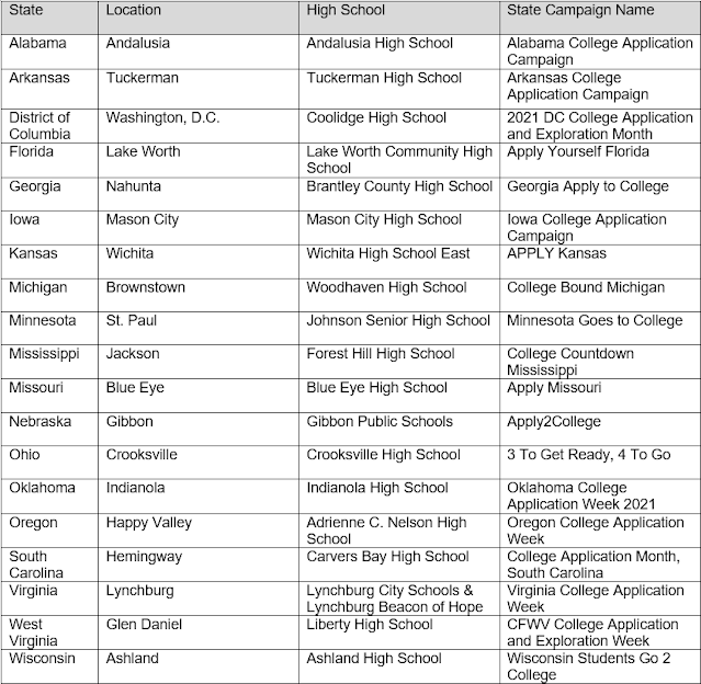 IOWA CITY, Iowa — The American College Application Campaign (ACAC), a national effort to increase the number of first-generation college students and students from low-income families pursuing a college degree or other higher education credential, today announced its 2021 School of Excellence award winners, a group of exemplary schools across the nation that are helping students pursue postsecondary success.