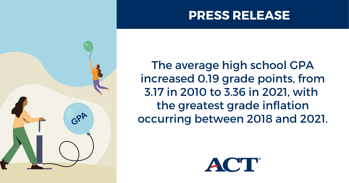IOWA CITY, Iowa (May 16, 2022) — A new report from ACT, the nonprofit organization that administers the ACT college readiness exam, finds evidence of grade inflation in high school seniors’ GPAs between 2010 and 2021. The average high school GPA increased 0.19 grade points, from 3.17 in 2010 to 3.36 in 2021, with the greatest grade inflation occurring between 2018 and 2021.
