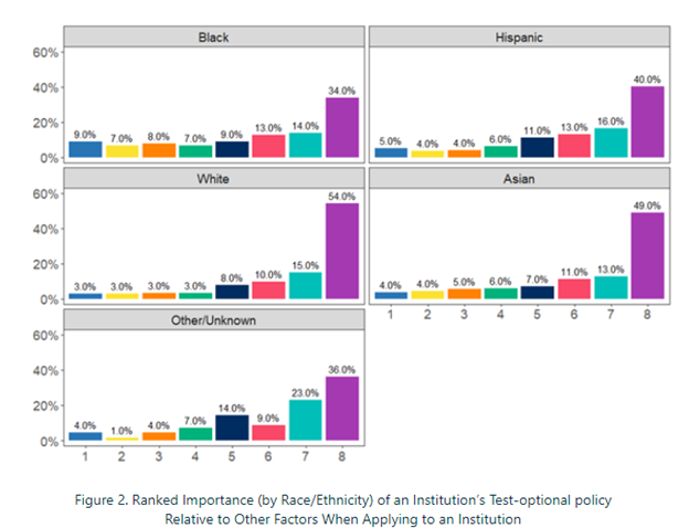 This held true across racial and ethnic groups when observing how students ranked an institution’s test-optional policy relative to other characteristics. Even among traditionally underrepresented populations who are often meant to benefit the most from test-optional policies, 34% of Black students and 40% of Hispanic students ranked these policies as the least important factor when selecting an institution.