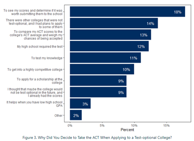 Given the growing popularity of test-optional college admissions policies, it is important to ask: Where does the ACT test fit into student plans when preparing for postsecondary education? To help answer this question, my research team designed a survey asking students why they chose to take the ACT when applying to colleges that didn’t require a standardized test score for admission.