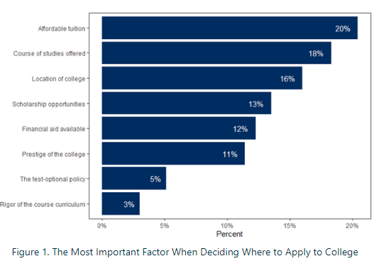 We also asked these students, who took the test in June 2022 and applied to both test-optional and test-required colleges, to rank the most and least important factors they considered when deciding where to apply for college and found that test-optional policies were less important, while financial reasons were cited most often.