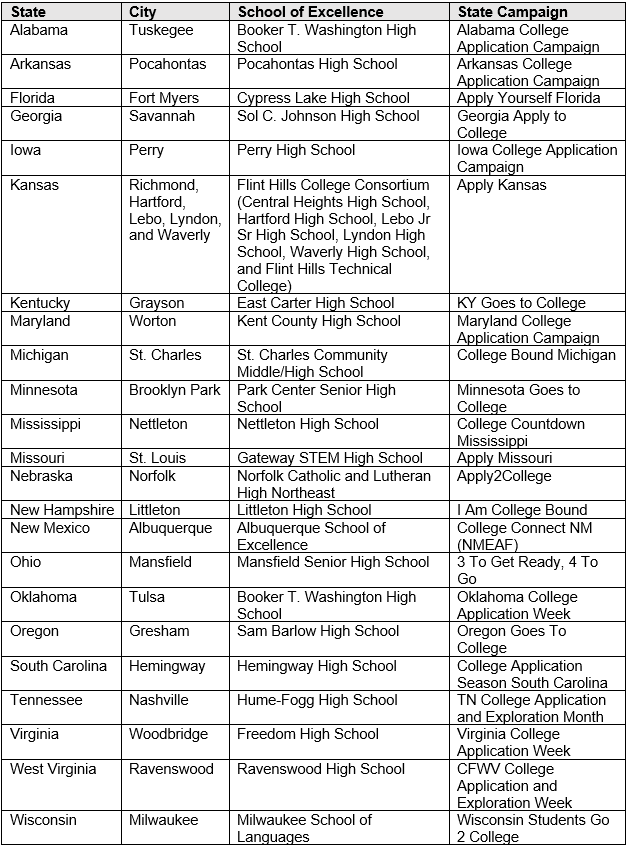 ACAC selected the 23 School of Excellence awardees based on their demonstrated commitment to student success and for serving as exemplary models for their state’s college application campaign. This is the fourth year that ACAC has recognized outstanding schools.