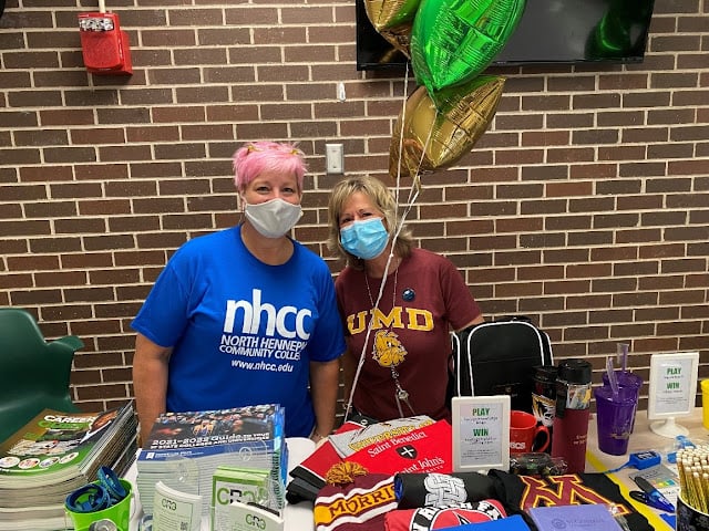Ms. Schreiner, college and career specialist, and Ms. Hansen, college and career education support professional, kick off College Knowledge Month during lunchtime in October. Students played Bingo and College Mascot Match, and attended sessions in the Career Resource Center to win college gear and other prizes. Credit: Minnesota Goes to College