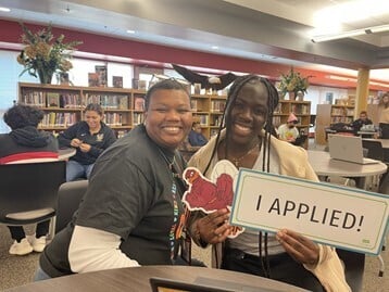 Beloved counselor Tasha Dykes with Gaby Asuako, a senior who just finished her application and will attend Old Dominion University. Credit: Virginia College Application Week