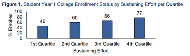 For example, only 46% of high school students who scored in the bottom quartile (the bottom 25%) of sustaining effort were enrolled in college one year after high school, compared with 77% of students who scored in the top quartile (the top 25%).