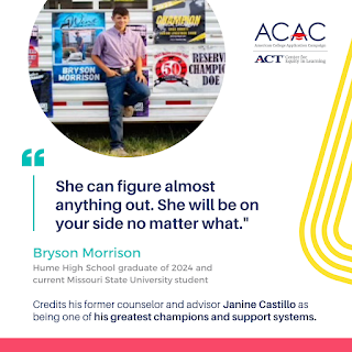 Bryson Morrison, Missouri 2024 Hume High School graduate and Missouri State University student, credits his former counselor and advisor Janine Castillo as one of his greatest champions and support systems during the college selection and application process. Castillo connected Morrison to athletic coaches and staff at various universities — an invaluable connection for a student-athlete. Castillo presented opportunities for campus tours and kept Morrison informed about school events and meetings focused on financial planning and applying to universities, as well as tests to help decide which school would be right for him based on his personal and career interests.