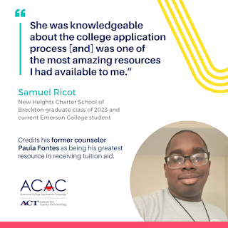 Samuel Ricot, Massachusetts 2023 New Heights Charter School of Brockton graduate and Emerson College student, also credits his former counselor Paula Fontes as helping him tremendously throughout his college application journey. With Fontes on his side, Ricot didn’t have to stress when it came to finding simpler ways of doing things — or when waiting for decisions. Fontes kept Ricot abreast of different scholarship opportunities, and with her guidance, Ricot was awarded enough aid to cover his entire tuition at Emerson College.