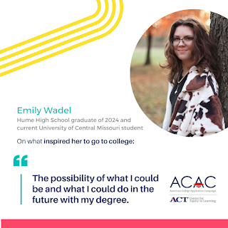 When asked what inspired her to apply to college, Missouri 2024 Hume High School graduate and University of Central Missouri student Emily Wadel said, “The possibility of what I could be and what I could do in the future with my degree [...] The connections and the people are incredible and the memories you’ll make — good and bad — will shape you into a better person.”