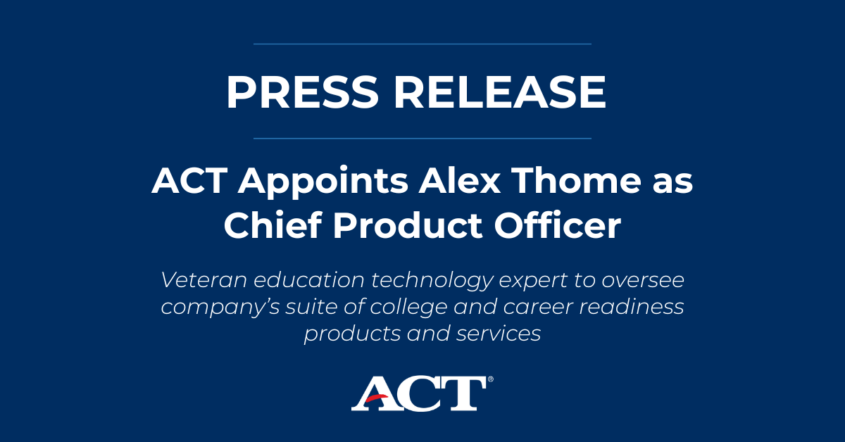 IOWA CITY, Iowa – ACT announced today that it has appointed Alex Thome as the company’s chief product officer, a strategic leadership role focused on advancing product innovation, customer experience, and market expansion. Thome will head product strategy to further innovate ACT’s portfolio of education and workforce assessments.