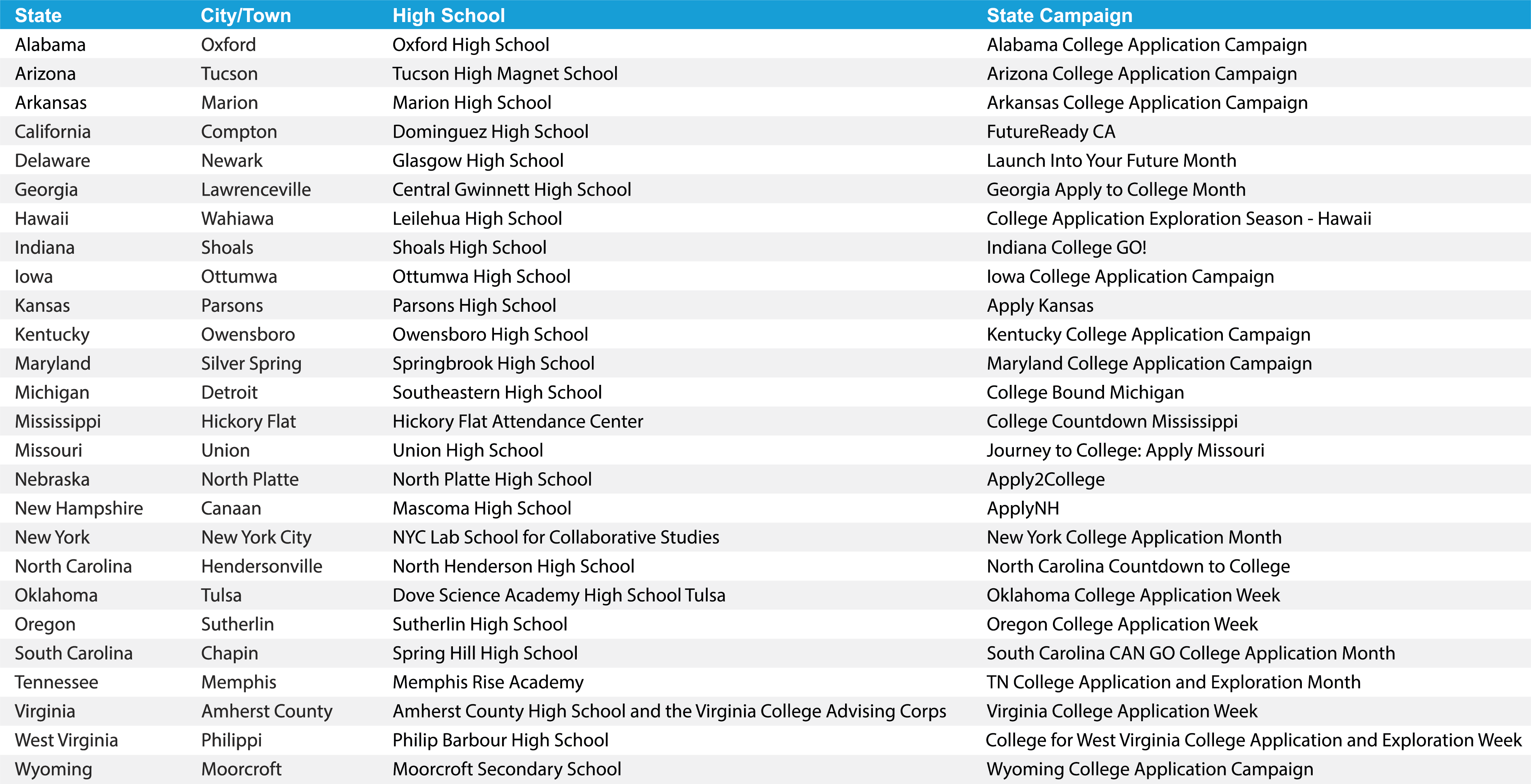 Awardees demonstrated a strong commitment to student success and served as outstanding models for their state’s college application campaign. The 26 winning schools listed below were key contributors to this year’s successes: