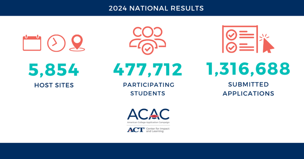 The American College Application Campaign (ACAC), a national initiative of ACT’s Center for Impact and Learning, is designed to increase the number of first-generation college students and students from under-resourced communities who pursue a postsecondary degree. The purpose is to assist high school seniors as they navigate the college application and admissions process and ensure each participating student submits at least one admissions application. https://impactandlearning.act.org.