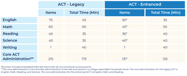 The enhanced ACT has a total of 131 questions across the English, math, and reading sections versus 175 for those sections on the legacy test. Timewise, students now have 2 hours and 5 minutes to complete these sections versus 2 hours and 20 minutes previously.