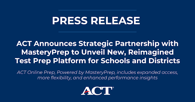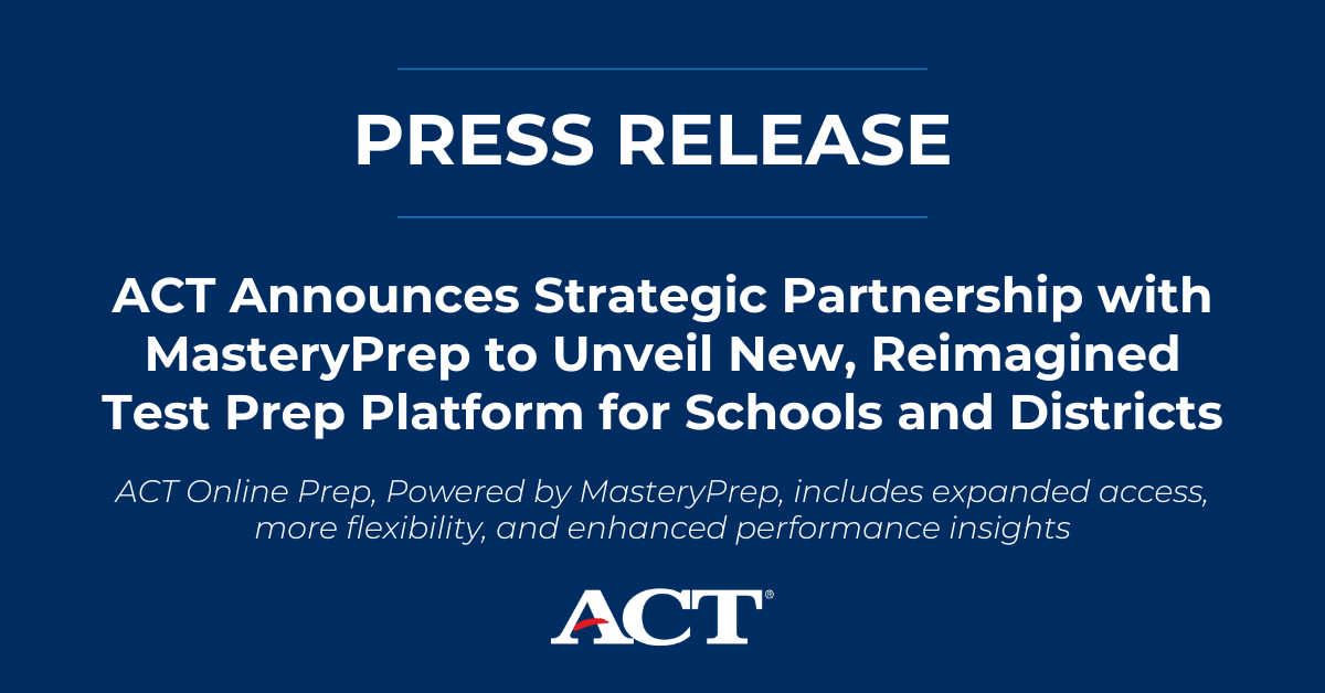 IOWA CITY, Iowa — Today, ACT announced a strategic partnership with MasteryPrep to transform in-classroom test preparation and expand access to high-quality, standards-aligned tools for educators. Built on a commitment to providing innovation and personalized support at an affordable price point for schools and districts, the collaboration includes debuting a new and improved, industry-leading platform for test preparation called ACT Online Prep, Powered by MasteryPrep.